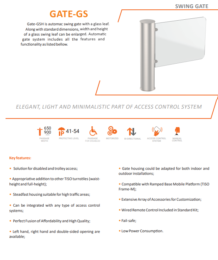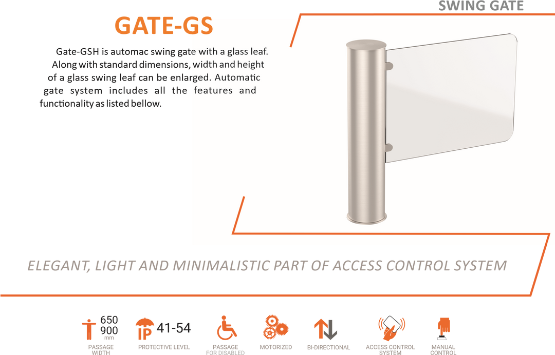 Poarta automata Gate GS 203 combina eleganta cu functionalitatea, fiind solutia ideala pentru birouri, institutii si centre comerciale unde se cere un control acces fiabil si estetic.