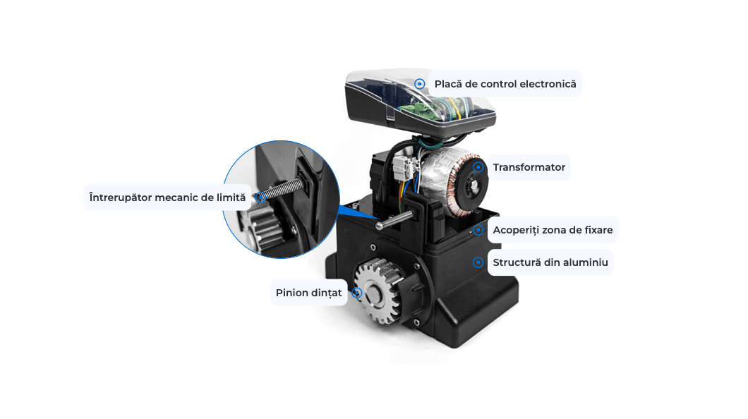 Motorul este alimentat la 230 VAC, genereaza 36 VDC / 500 W, si dezvolta o forta de actionare de 550 N, putand deplasa porti de pana la 1200 kg.