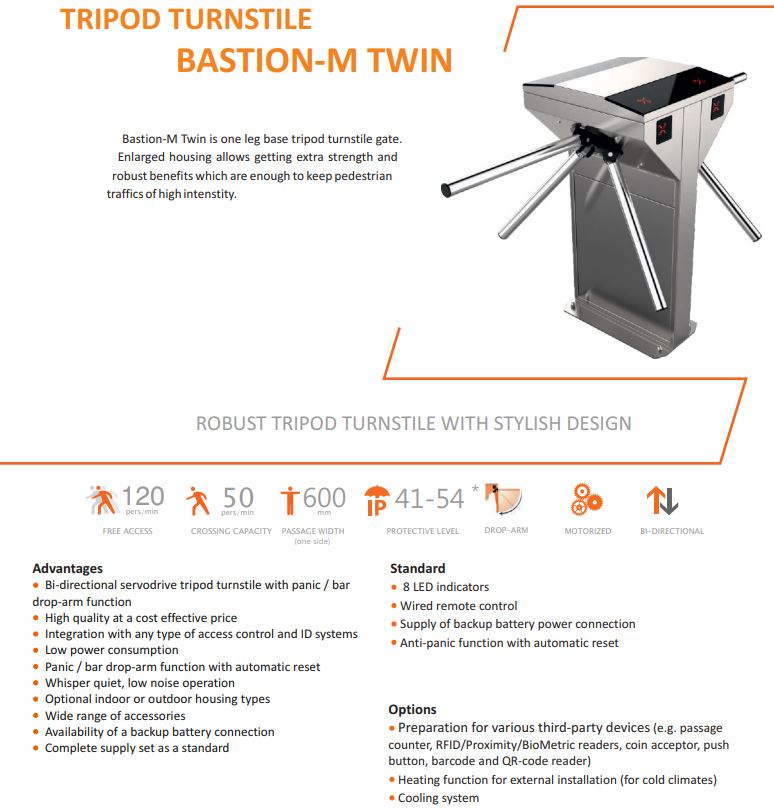 Bastion M Twin este un turnichet tripod servo-motorizat dublu, proiectat pentru trafic intens. Cu doua pasaje de 600 mm, functie „drop-arm” anti-panica si LED-uri de semnalizare, ofera un flux de pana la 120 persoane/minut, avand o constructie robusta din inox AISI 304/316.