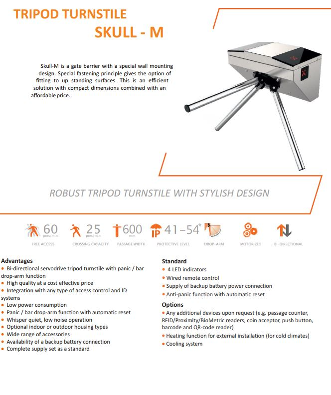Skull M este un turnichet tripod mural, servoactionat si bidirectional, cu latime de trecere de 600 mm. Conceput pentru spatii inguste, integreaza functia „drop-arm” anti-panica, LED-uri de semnalizare si compatibilitate cu sisteme moderne de control acces, asigurand siguranta si eficienta la trafic intens.