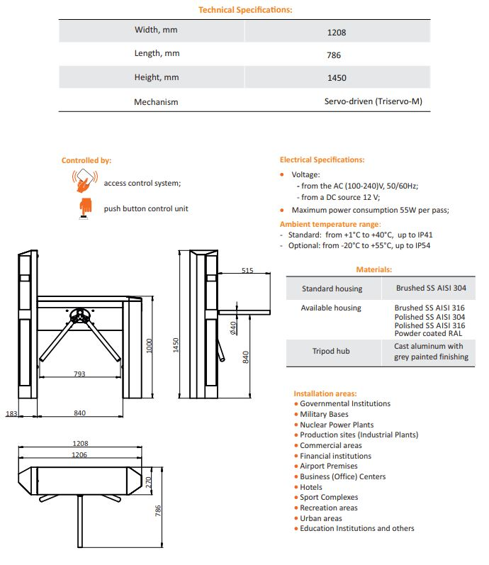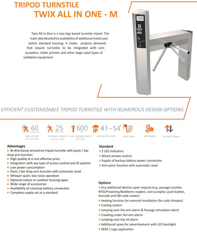 Twix All-In-One M este un turnichet tripod servoactionat, cu brate din inox lustruit si functie „drop-arm” anti-panica. Integreaza LED-uri de semnalizare si suport pentru RFID, avand latime de trecere de 600 mm si capacitate de pana la 60 persoane/minut. Ideal pentru zone cu trafic intens si securitate ridicata.
